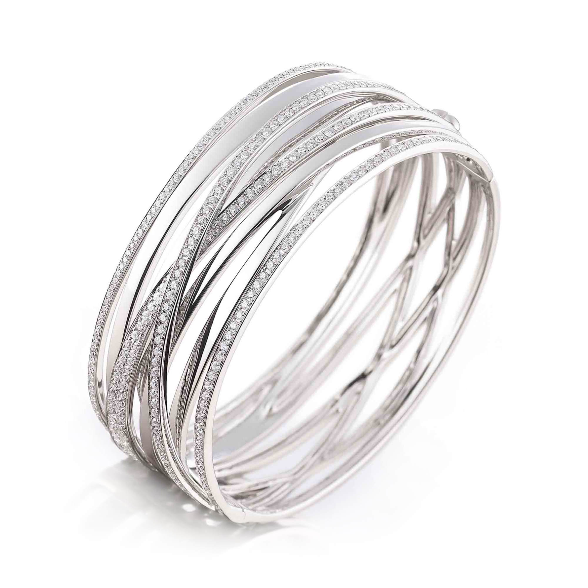 Mit Diamanten besetzte Bahnen verschmelzen mit 18karatigen Goldlinien und lassen ein zu jedem Anlass tragbares Schmuckstück entstehen!
