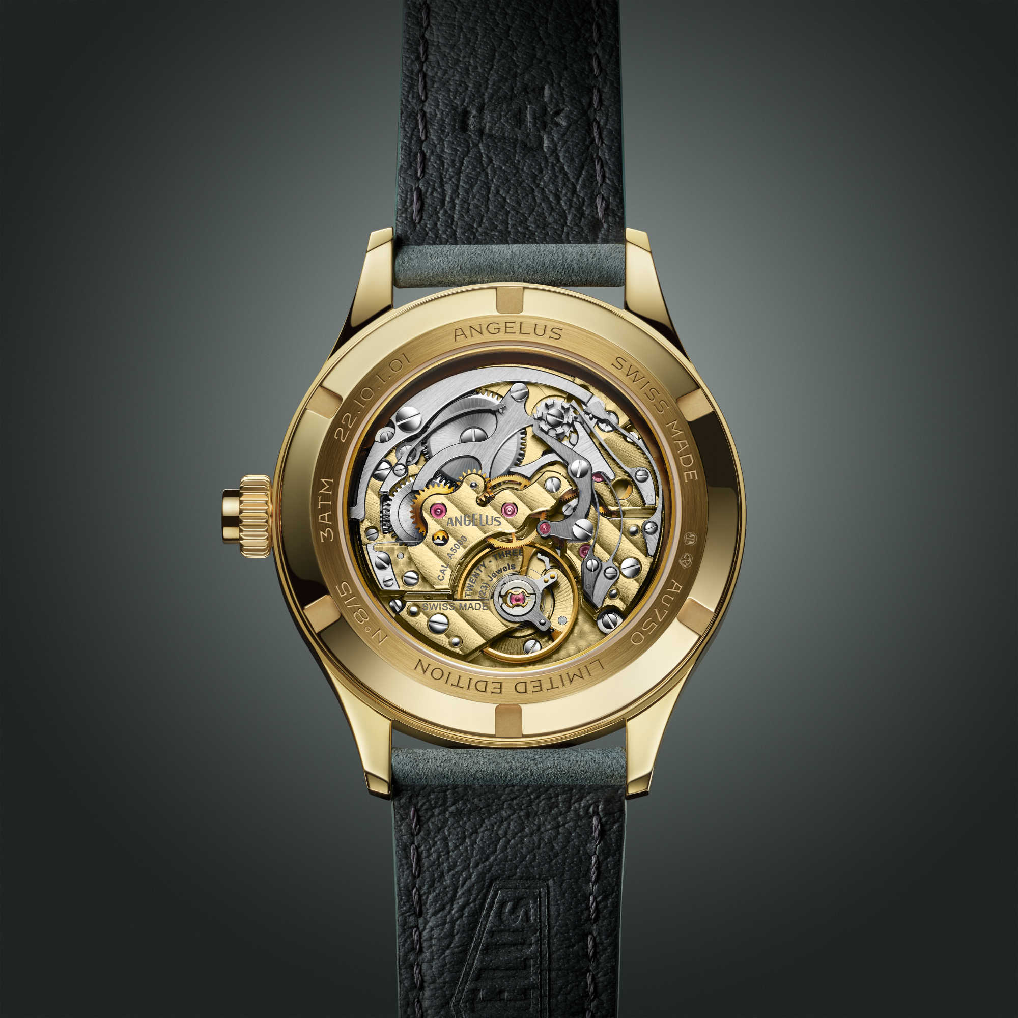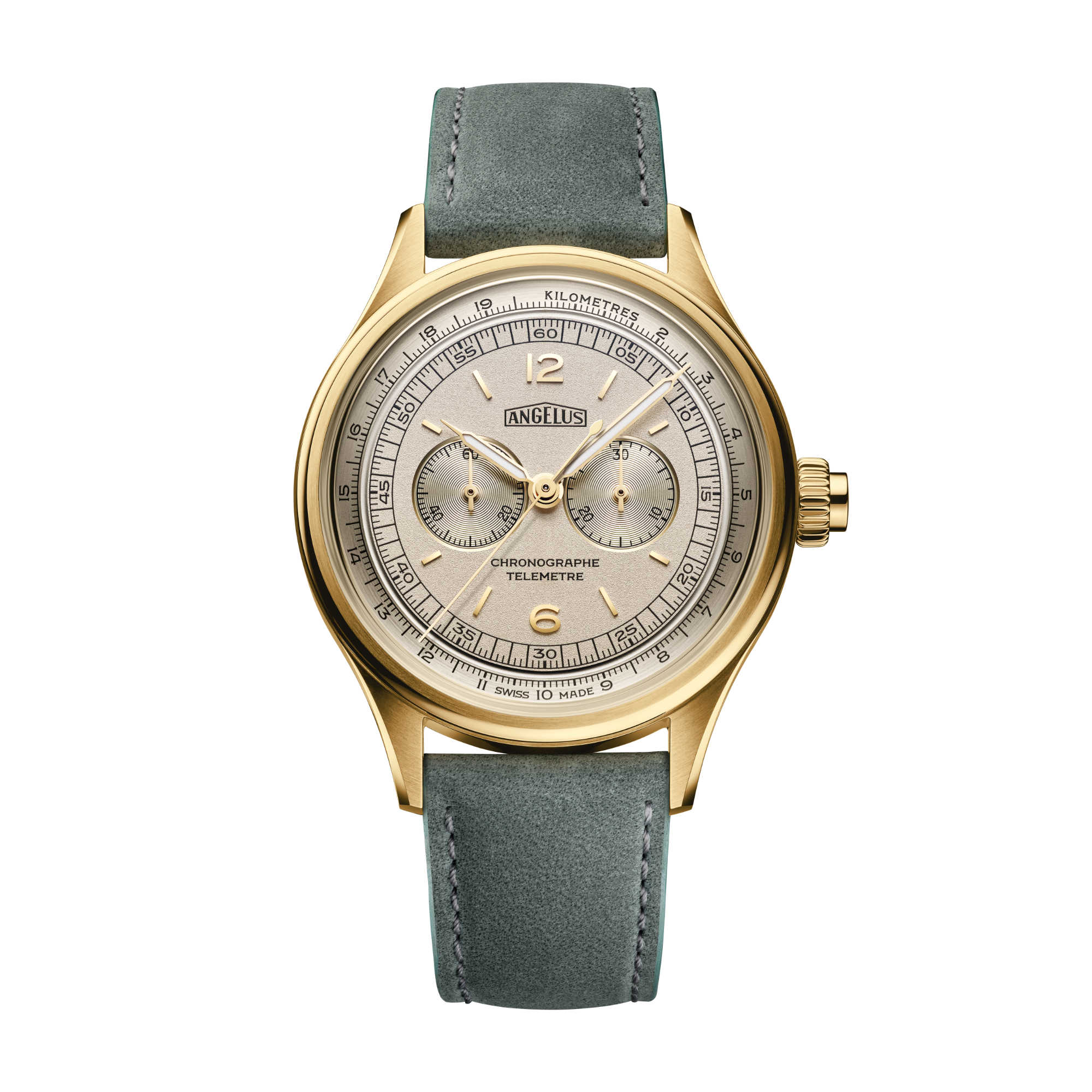 Ref. 0CHCQ.I01A.V010Q - Mit einem Durchmesser von 37 mm, einem Zifferblatt im Vintage-Stil und einem in die Aufzugskrone integrierten Monodrücker enthält dieses Zeitmessinstrument für kurze Intervalle unzählige Hommagen an die reiche Geschichte von Angelus und insbesondere an seine Spezialisierung auf die Herstellung von Chronographen. Sein edler Handaufzugsmechanismus, seine historischen Wurzeln und seine hochwertige Verarbeitung verleihen diesem Chronographen eine äußerst elegante Retro-Ästhetik.