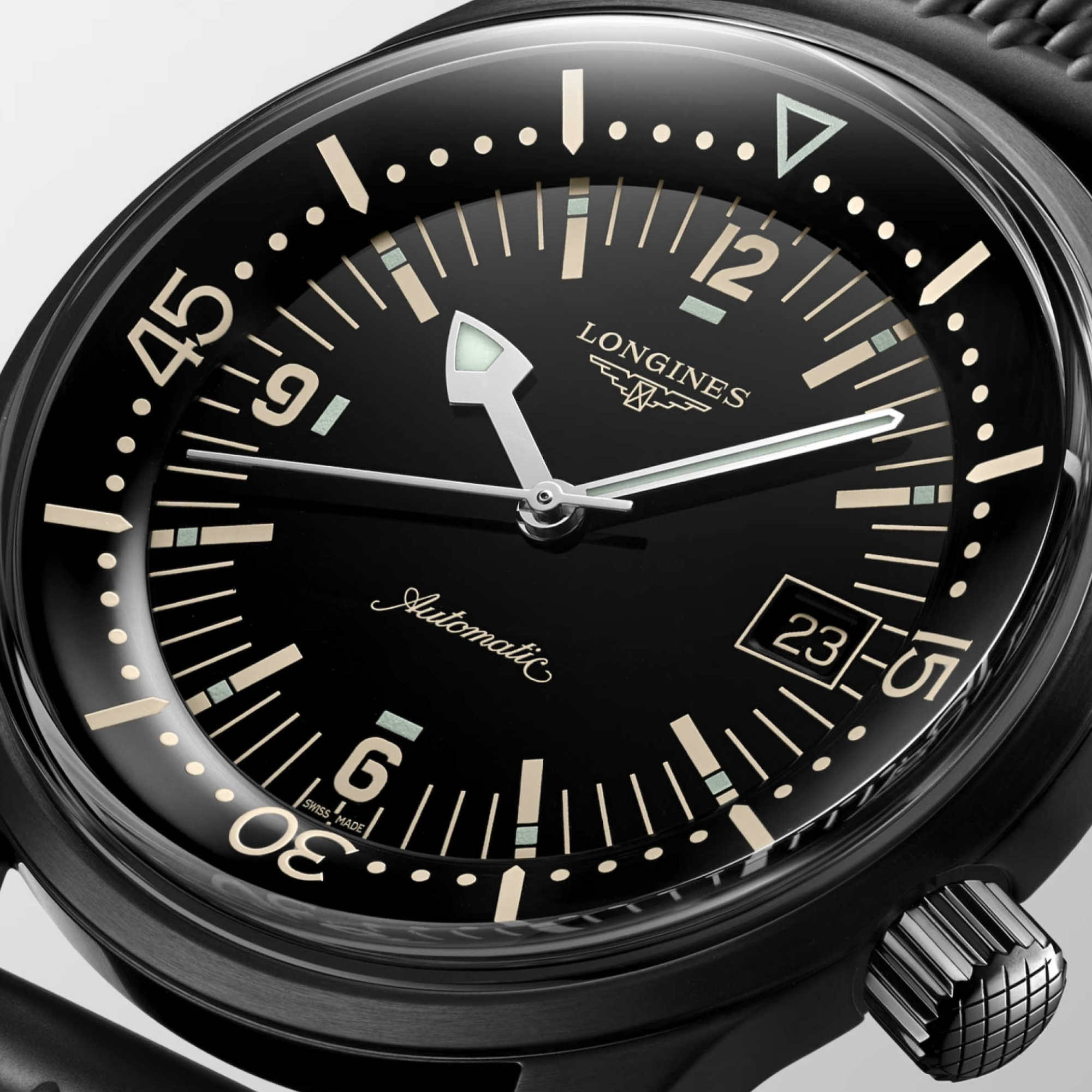 Lackschwarz mit Indizes, die von Super LumiNova®-Vierecken durchbrochen sind, und arabischen Ziffern, die von leuchtenden Rechtecken hervorgehoben werden