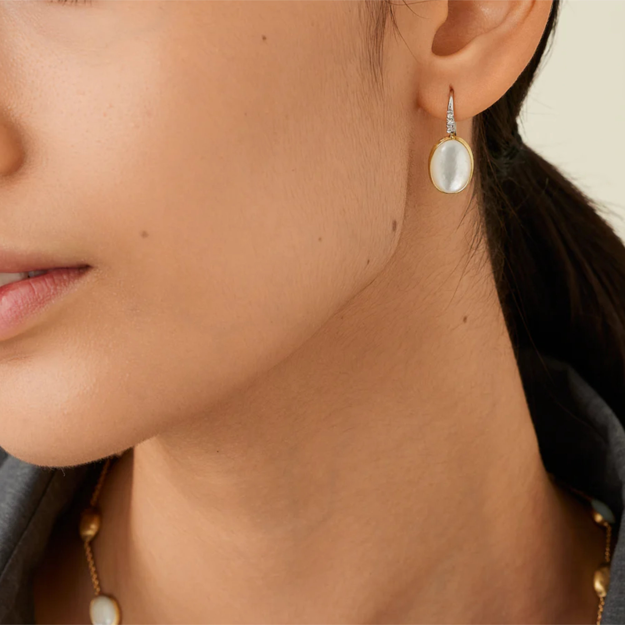 Ref. OB1799-AB MPW YW - Die edle Anmutung dieses Hängeohrrings mit zwei erlesenen weißen Perlmutt-Einsätzen wird vollendet durch einen feinen Haken mit Diamantpavé. Die Fassung besteht aus Gelbgold mit 18 Karat und ist in einer antiken Technik mit dem Fadenstichel von Hand graviert.