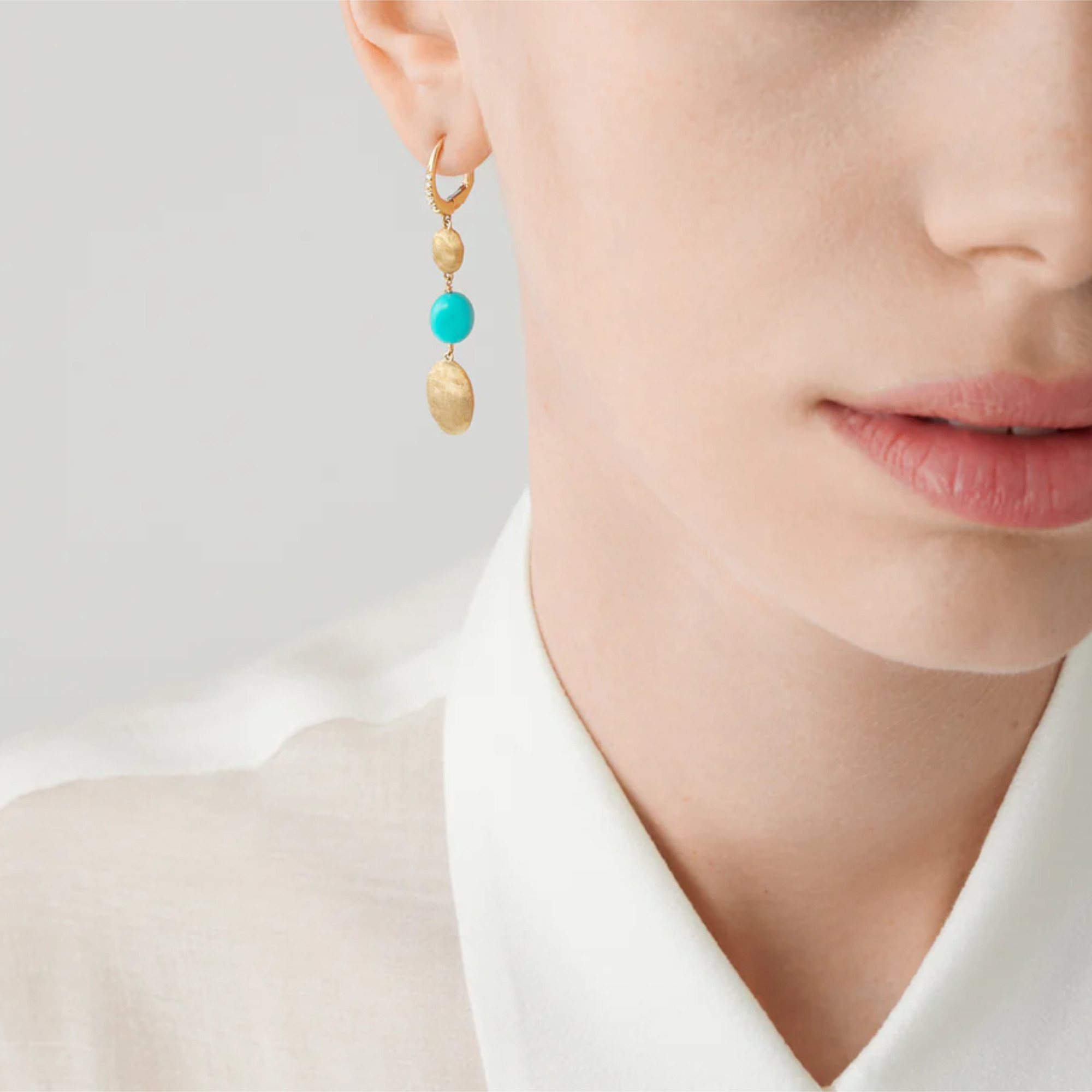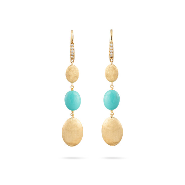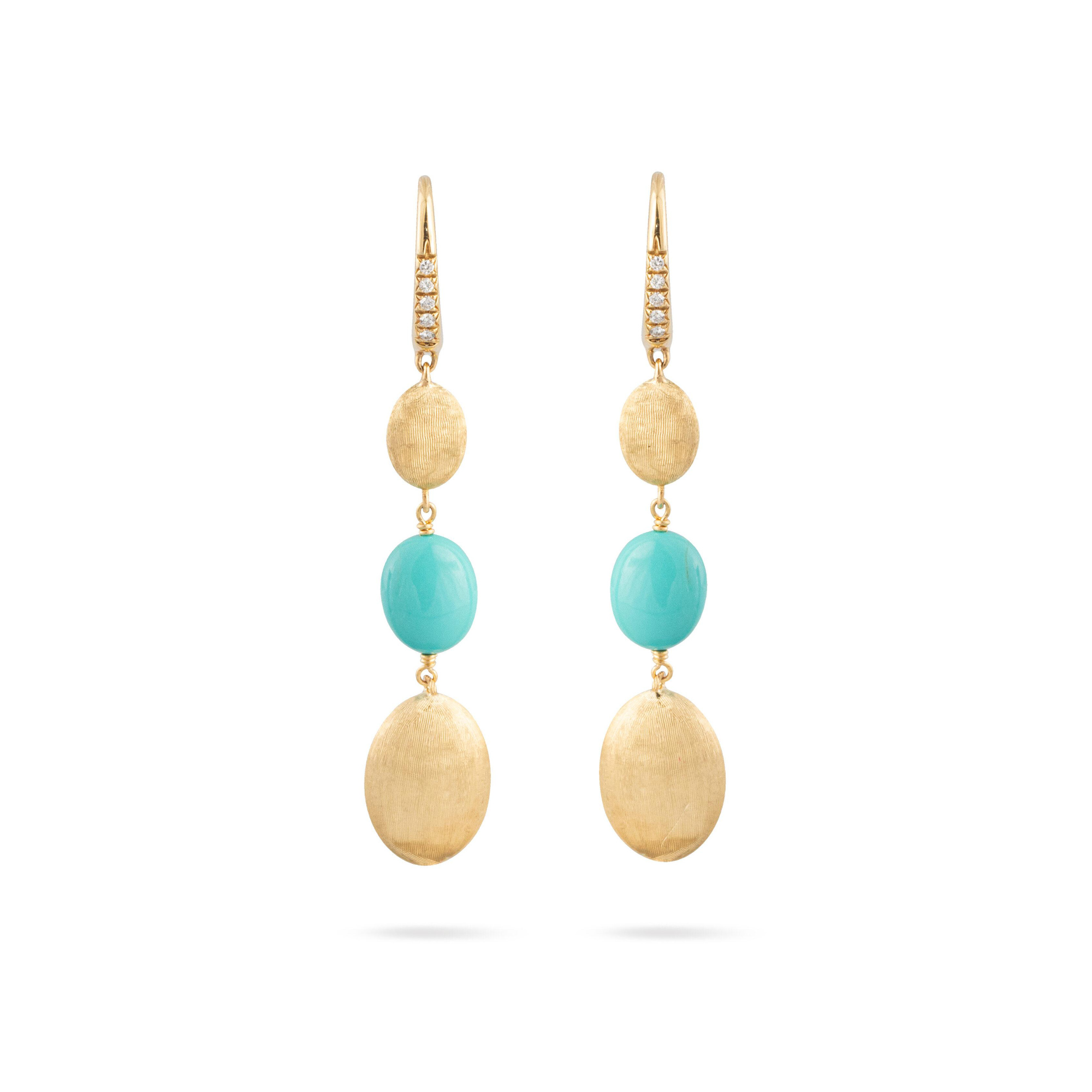 Ref. OB1857-MB TU01 Y - Diese Ohrringe aus 18-karätigem Gelbgold zeichnen sich durch bezaubernde ovale Cabochon-Türkis-Edelsteine und ovale Goldperlen aus, die in der alten Florentiner Technik fein von Hand graviert wurden. Pavé-Diamanten zieren die Vorderseite des Clipverschlusses. Sie sind perfekt für jeden Anlass und verleihen jedem Ensemble einen Hauch von Sommerflair.