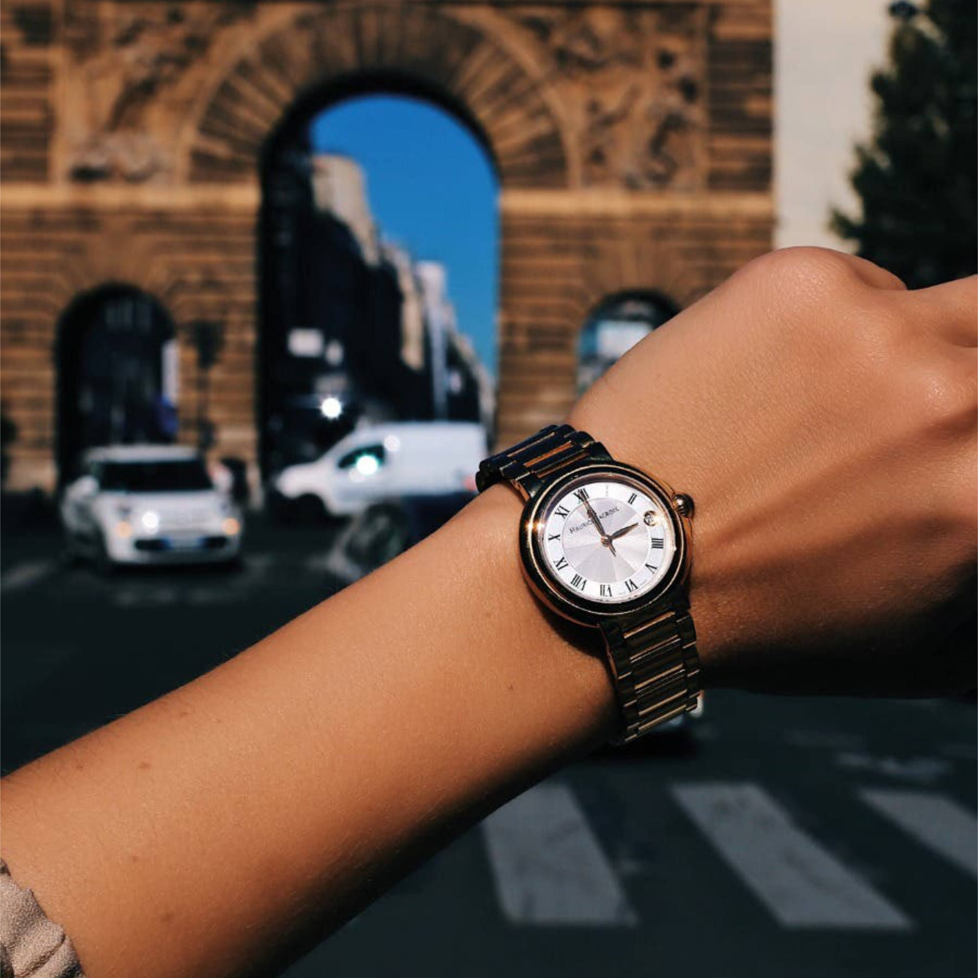 Edelstahl bicolor rosévergoldet und silberfarben mit Faltschließe und Drückern