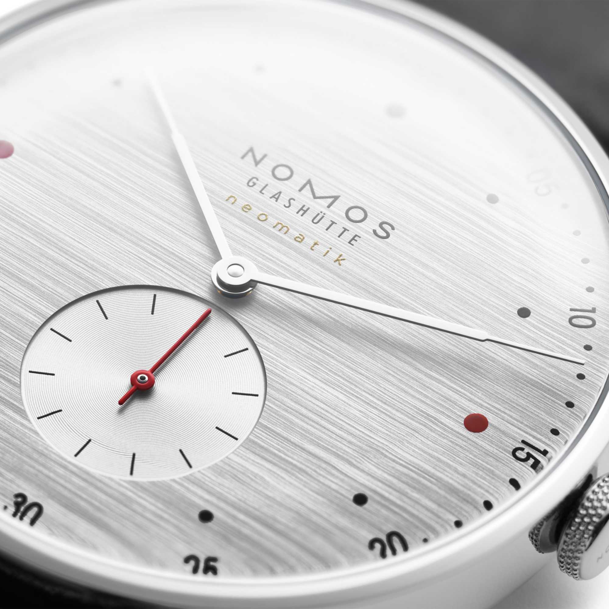 Glashütter Dreiviertelplatine; NOMOS-Unruhbrücke; 27 Rubine; beidseitig aufziehender Rotor; Incabloc-Stoßsicherung; NOMOS-Swing-System mit temperaturgebläuter