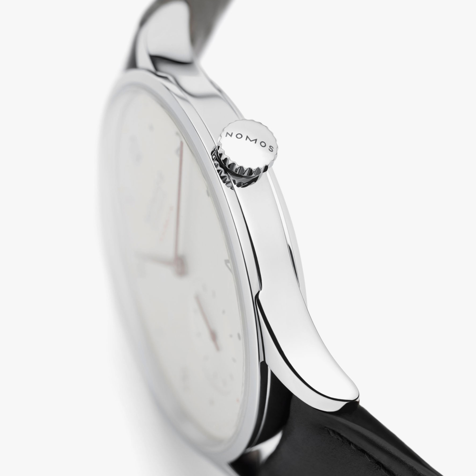 Hauseigenes Manufakturkaliber mit Automatikaufzug; NOMOS-Swing-System mit Unruhspirale temperaturgebläut