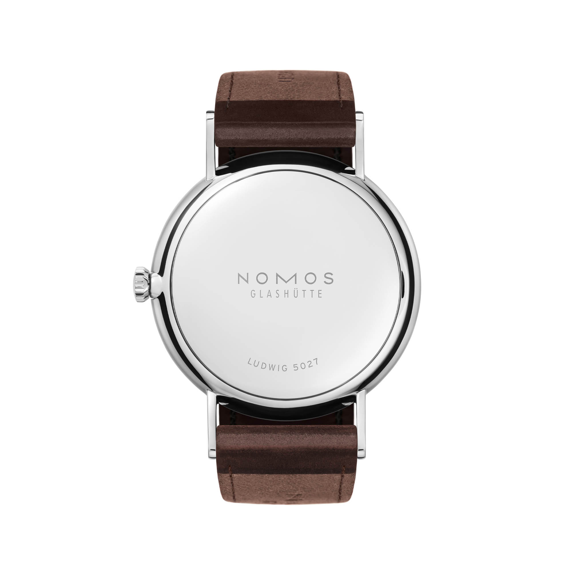 temperaturgebläute Schrauben, rhodinierte Werkoberflächen mit Glashütter Streifenschliff und NOMOS-Perlage, Sperr- und Konrad mit Glashütter Sonnenschliff