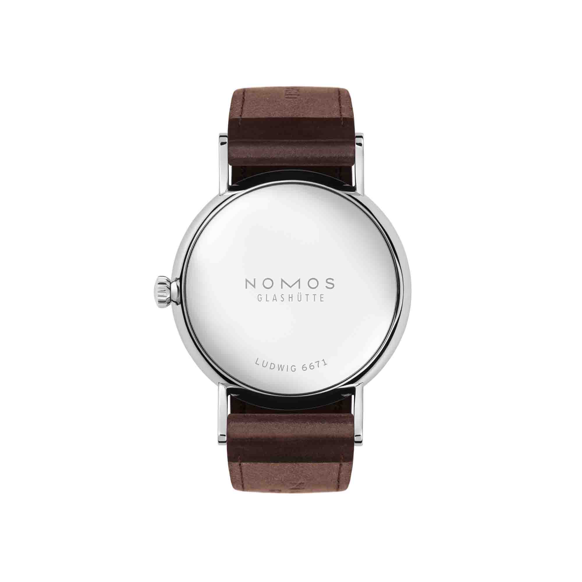 Ref. 242 - 175 Jahre Glashütter Tradition ins Heute übersetzt: NOMOS-Klassiker Ludwig mit römischen Ziffern auf glänzend emailleweißem Grund. Als Zwei-Zeiger-Modell mit einem Durchmesser von 33 Millimetern steht Ludwig 33 Duo zarten Handgelenken besonders gut.
