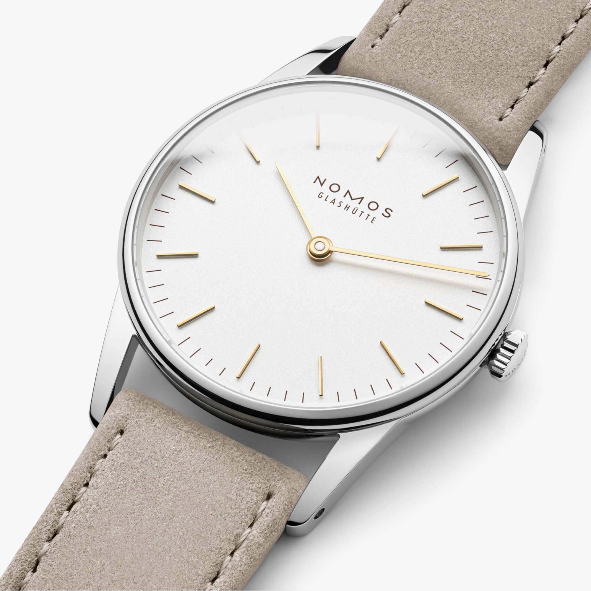 Ref. 320 - Goldene Zeiger und Indizes, ein Gehäuse aus Edelstahl, das Zifferblatt weiß versilbert: Orion 33 Duo passt zu jedem Schmuck – und schmückt mit einem Durchmesser von 33 Millimetern vor allem zartere Handgelenke. Mit ihren zwei goldenen Zeigern ist die Uhr zudem noch reduzierter, aber auch femininer als die NOMOS-Standardmodelle.