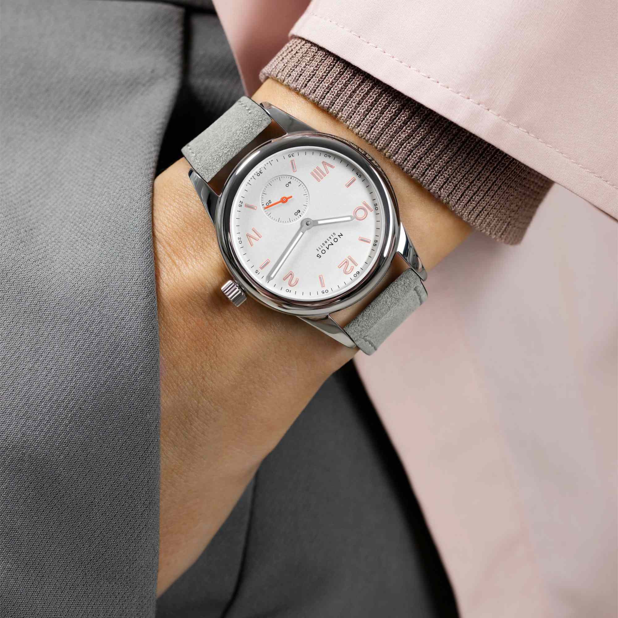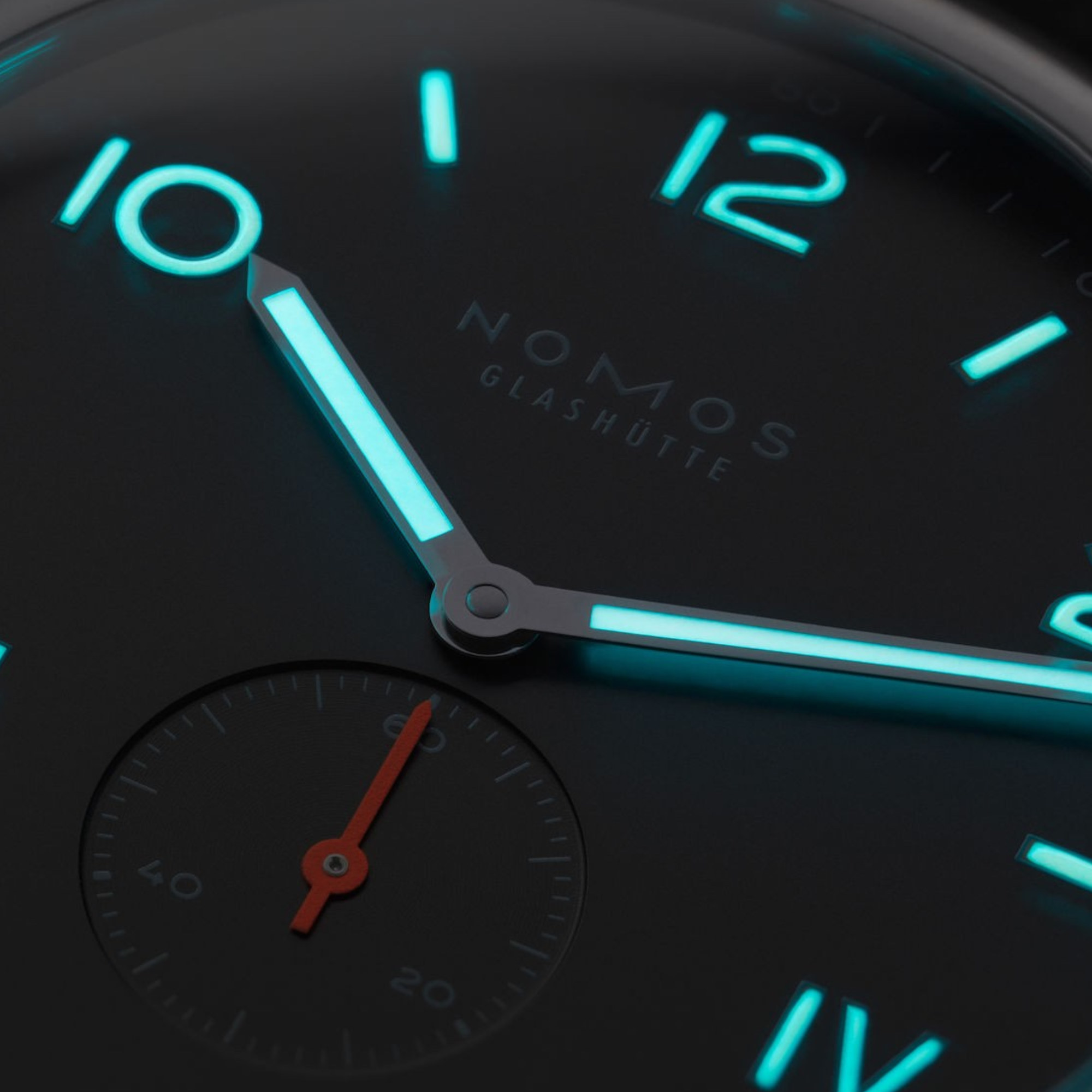 Zeiger: Stunden- und Minutenzeiger rhodiniert und mit Superluminova ausgelegt (blau nachleuchtend); Sekundenzeiger neon-orange