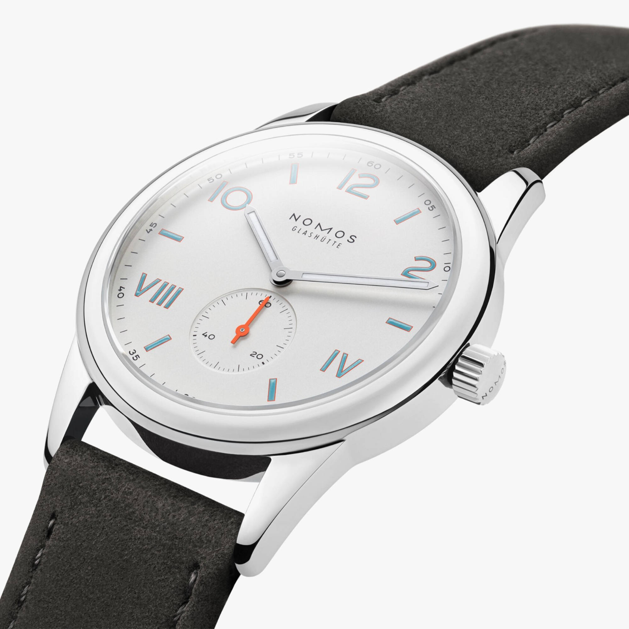 Zeiger: rhodiniert, mit Superluminova weiß ausgelegt (blau nachleuchtend), Sekundenzeiger neonorange