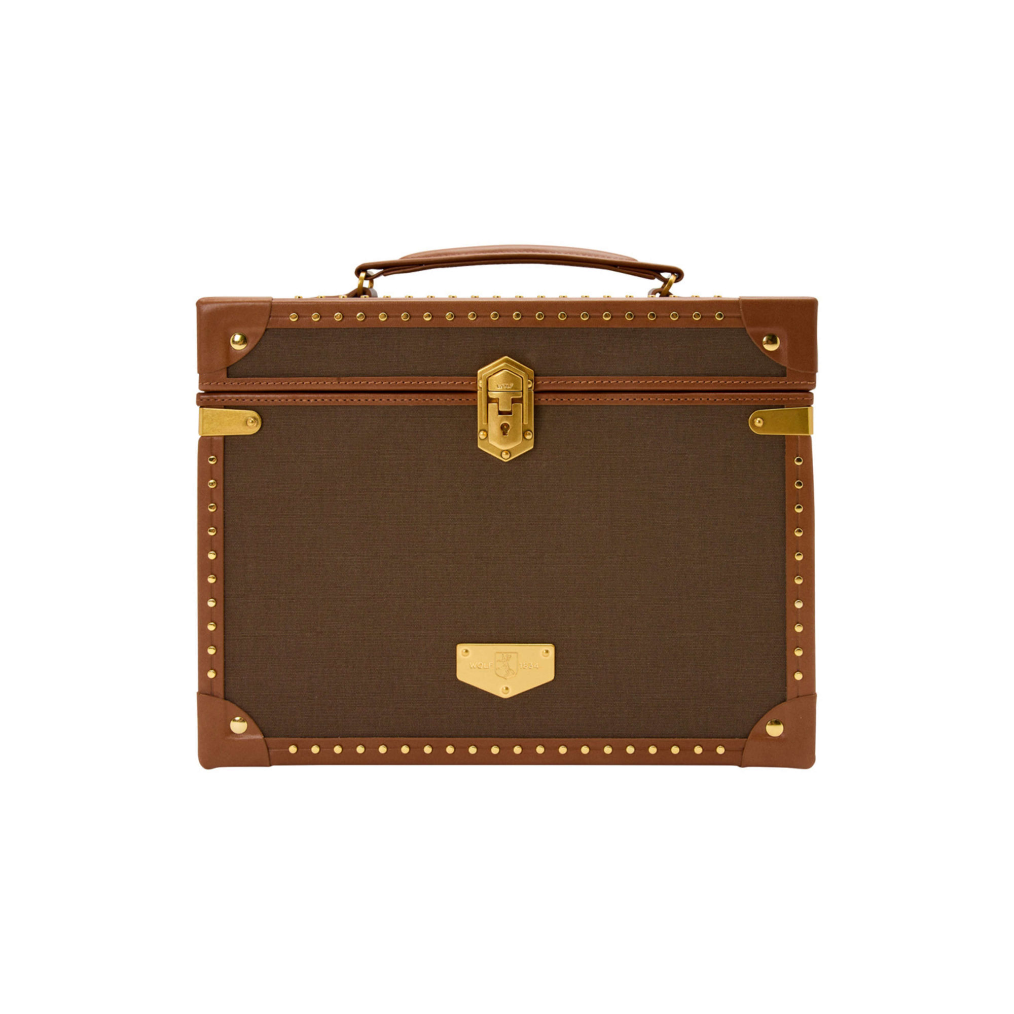 Ref. 190041 - Ida, eine Schmuckschatulle im Kofferformat mit einer Außenseite aus recyceltem Canvas in luxuriösen gedeckten Farbtönen, mit Oberlederbesatz, Messingnieten, einem speziellen Schloss und der exklusiven Plakette zum 190-jährigen Jubiläum. Im Inneren verfügt das mit LusterLoc™ behandelte Ultrasuede-Futter über mehrere Fächer, Ringhalterungen, abgedeckte Ablagen und drei Schubladen mit Fächern, darunter ein kleines Reiseetui. Die perfekte Mischung aus Eleganz und Funktionalität, inspiriert von Idas Reisekoffer.